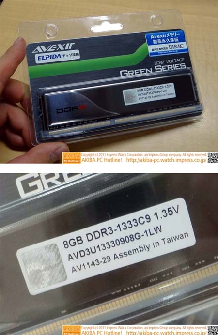 Оказывается, приготовила она оперативную память с низким рабочим напряжением, но не для нас, а для Японии, хотя экспорт в другие страны вполне возможен. Представлен модуль оперативной памяти ёмкостью 8ГБ, тактовая частота работы которого составляет 1333МГц при таймингах 9-9-9-24, и напряжении 1.35 вольт. Примечательно, что напряжение автоматически поднимается до стандартных 1.5 вольт, если замечается несовместимость с определённой материнской платой. Чипы памяти изготовлены компанией Elpida.