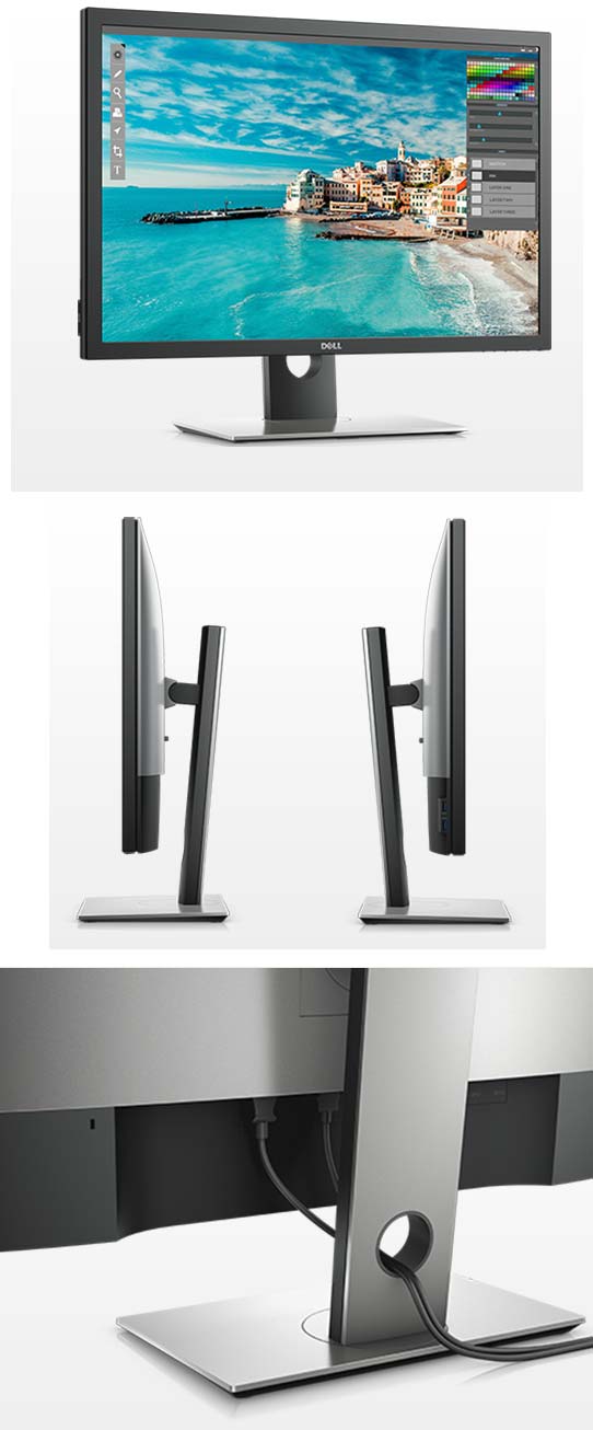 Монитор UP3017 от Dell поддерживает режимы PiP (картинка в картинке) и PbP (картинка рядом с картинкой), совместим с 100x100мм VESA креплением, обладает возможностями для кабель-менеджмента, имеет размеры 482.3~632.3x689.9x217мм, весит 6.49КГ (видимо, без подставки).
