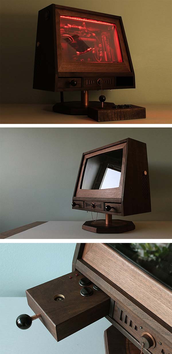 Представьте себе творение в стиле стимпанк - AiO ПК в деревянном корпусе, через выключенный экран которого видны всего подсвечиваемые красным светодиодом "внутренности". Плюс к этому наделите устройство СВО, достойной "начинкой", двумя аркадными стиками, проектором и получите R-Kaid Revelation. Название можно перевести "аркадное откровение", по всему новинка создана для проведения времени за ретро-играми, хотя она без труда потянет и современные, благо спецификации приличные.