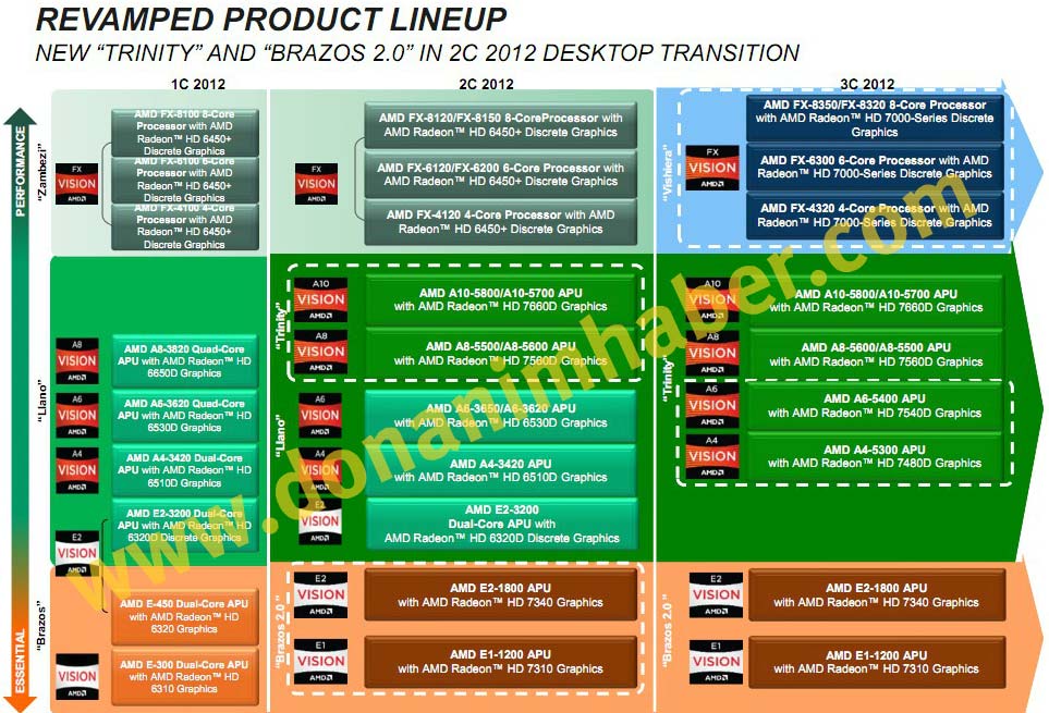 Как видно по содержимому графического файла, нас ждёт в ближайшее время выпуск некоторых процессоров семейства FX первого поколения, а в третьем квартале - второго поколения, хотя особой радости от их появления у меня точно не будет, ведь нам предложат всего лишь на 15% возросшую производительность на ядро, чего будет явно недостаточно, чтобы побороть Ivy Bridge, а значит вновь процессоры Intel поселятся в высокопроизводительных системах, а AMD - в остальных. На фоне процессоров FX даже APU смотрятся интереснее, хотя бы потому, что их применение куда шире их старших собратьев.