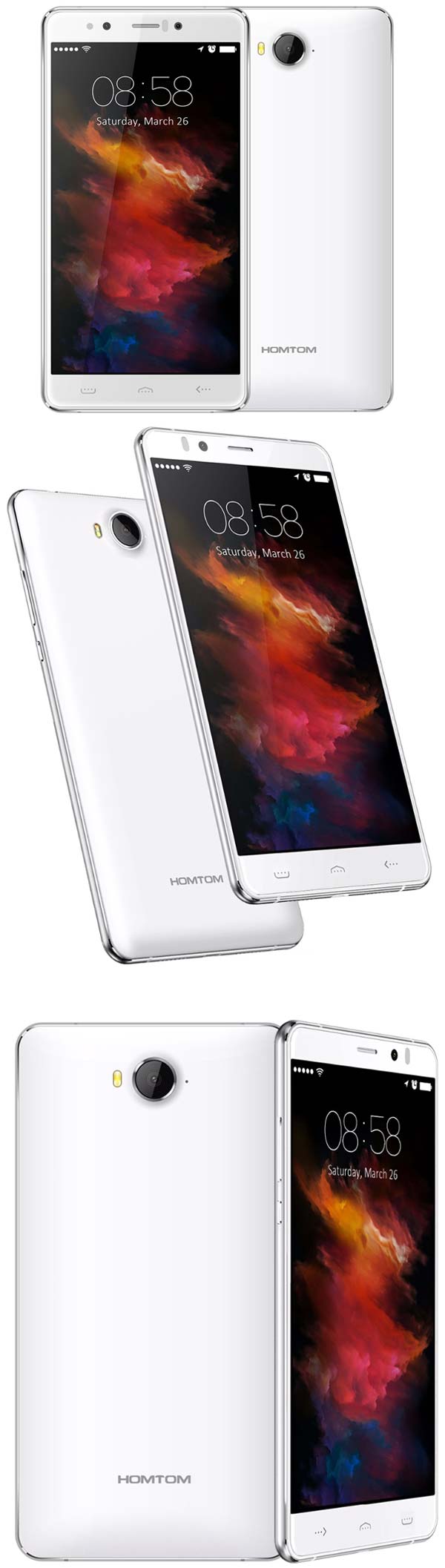 Творение Homtom работает в сетях GSM, WCDMA и FDD-LTE, поддерживает GPS/A-GPS, Bluetooth и WiFi. В наличии две камеры - 16МП тыловая и 5МП фронтальная, видео снимается в разрешении 1080p. Размеры составляют 150.5x77.6x8.9мм, вес не указан, а время автономной работы - 2~3 дня.