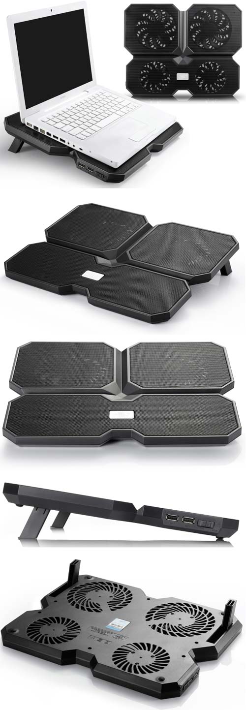 Речь идёт о кулере DN-84388, размеры которого составляют 38x29.5x2.4 сантиметра. Данное изделие предназначено для охлаждения ноутбуков, с диагональю экрана от 12 до 15.6 дюймов, сам процесс охлаждения будет осуществляться за счёт аж четырёх вентиляторов, имеющихся в DN-84388.