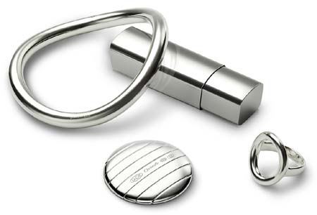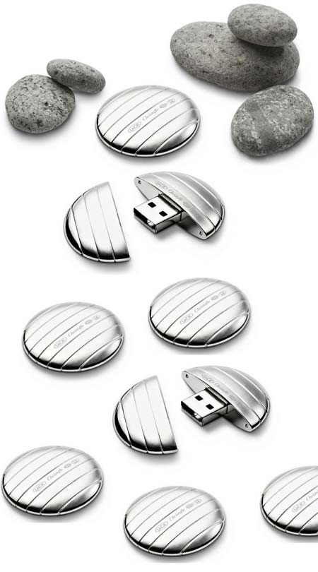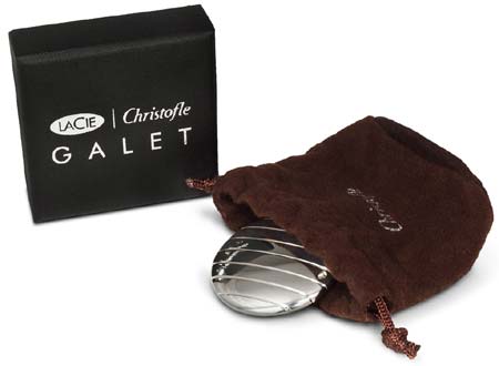 И вновь LaCie прибегает к услугам профессионалов дизайнерского дела - на этот раз в содружестве с французской компанией Christofle (специализирующейся на создании очень красивых серебряных украшений и ведущей эту деятельность аж с середины 19 века), "Лоси" выпускают 4ГБ флешку (USB 2.0 или же 3.0 - не понятно) Galet. Корпуса брелоков изготовлены из серебра (или по крайней мере, им покрыты) и смотрятся такие флешки очень элегантно (внешне напоминают морскую гальку, что и показано на фото ниже).