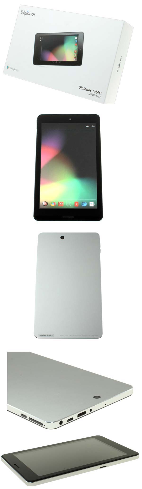 Полное название изделия - Diginnos Tablet DG-D07S/GP, у девайса 7" экран с разрешением 1280x800, этот тачскрин ёмкостного типа, поддерживает 5-точечный Multi-touch. Основой аппарата стала SoC Rockchip RK3168 (два ядра Cortex-A9 и графика PowerVR SGX540), производитель оснастил своё творение 1ГБ оперативной памяти и 8ГБ флеш памяти.