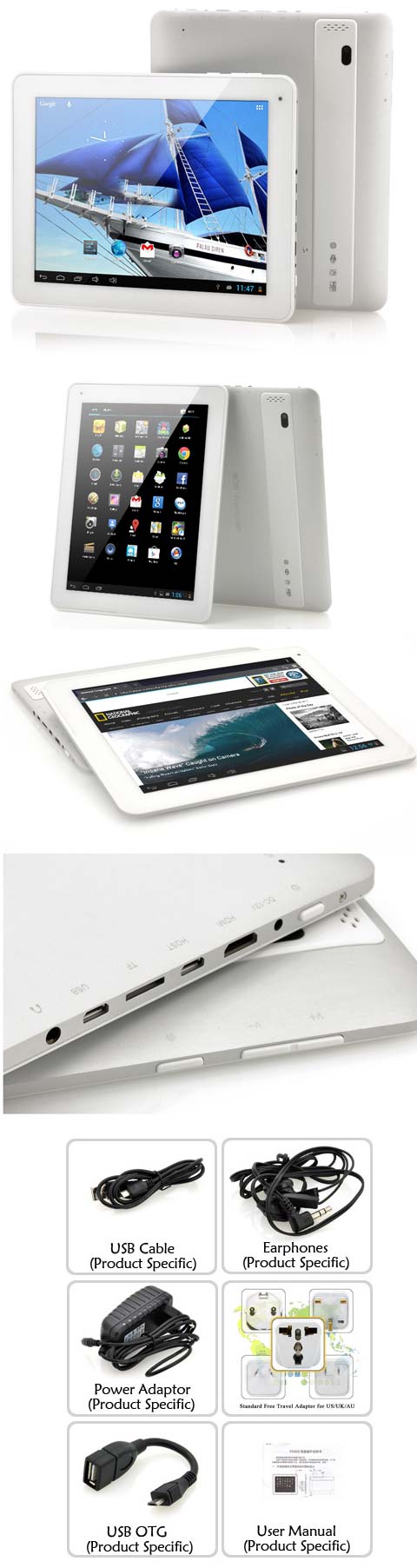 У планшета две камеры - 5МП задняя и 0.3МП фронтальная, также у него есть динамик и микрофон, плюс 3.5мм аудиовыход, порт Micro USB и OTG, слот для карт Micro SD и видеовыход HDMI. Управляется новинка Android 4.1, имеет сертификаты CE, FCC и RoHS.