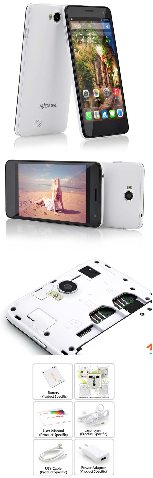 Смартфон работает в сетях GSM 850/900/1800/1900МГц и WCDMA 2100МГц, поддерживает 802.11 b/g/n WiFi, Bluetooth, GPS и FM радио, имеет 12МП основную камеру и 8МП фронтальную. Питается продукт MySaga от батареи на 2100 мАч, работает от которой всего 3 часа в активном режиме и до 72 часов в режиме ожидания. Управляется новинка Android 4.2.
