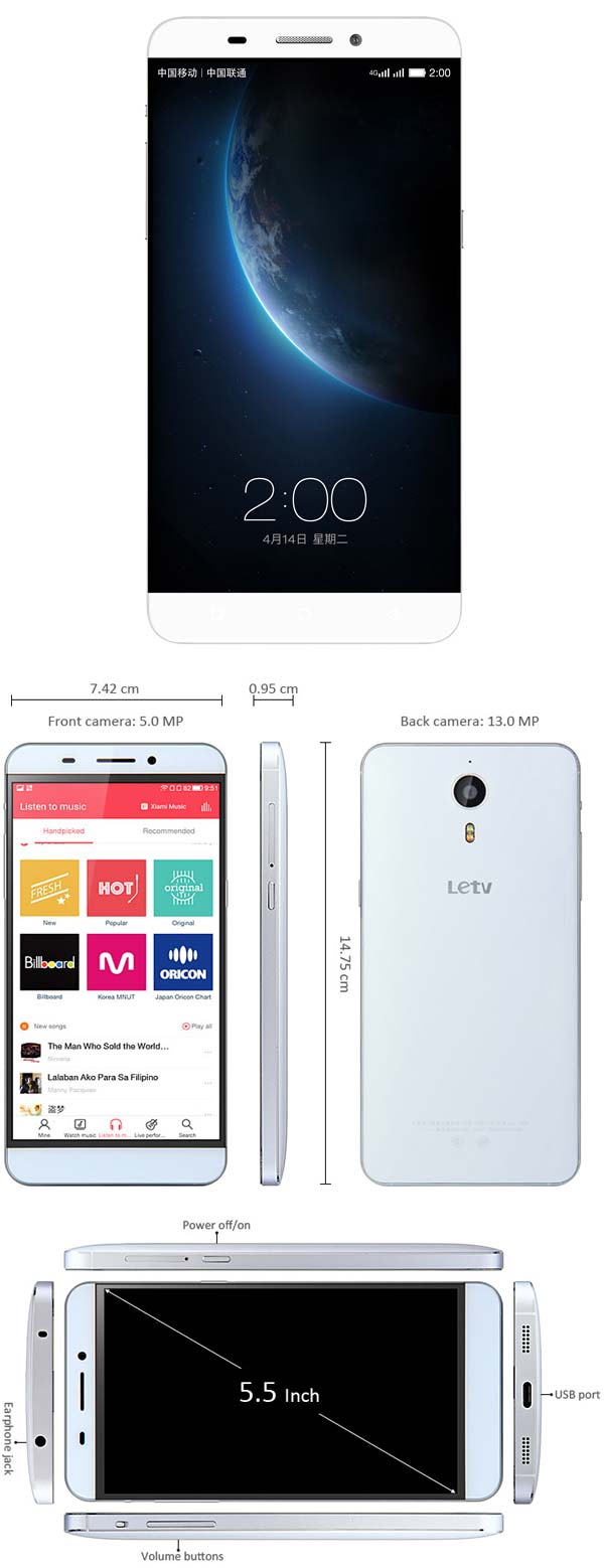Управляется новинка Android 5.0, имеет два слота для Micro SIM карт, поддерживает 4G, 3G, GPS, WiFi, Bluetooth и GSM. Тыловая камера Letv One X600 имеет 13МП сенсор, автофокус и LED вспышку, фронтальная - 5МП сенсор. Питается данный агрегат от батареи на 3000 мАч, имеет G-сенсор, датчик приближения, порт USB Type-C и 3.5мм аудиовыход.