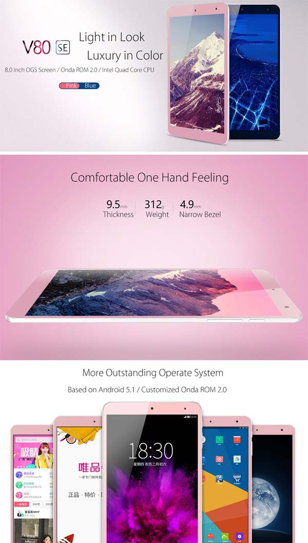 Управление планшетом взяла на себя операционная система Android 5.1. Новинка поддерживает 802.11b/g/n WiFi и Bluetooth, обладает 2МП тыловой и 0.3МП фронтальной камерами, портом Micro USB и 3.5мм аудиовыходом. Питается творение Onda от батареи на 4200 мАч, обладает размерами 214x125x9.5мм, весит 312 граммов.