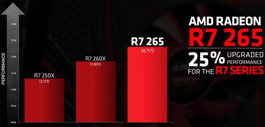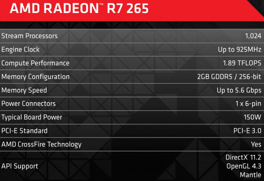 "Новинка" имеет 1024 потоковых процессора, графическое ядро Pitcairn Pro (почему тогда Anand писал о Curacao?) с 64 TMU и 32 ROP, интерфейс памяти 256-битный, её объём составляет 2ГБ. Питание новинка получает от 6-пинового коннектора БП, референсный вариант R7 265 занимает 2 слота расширения.