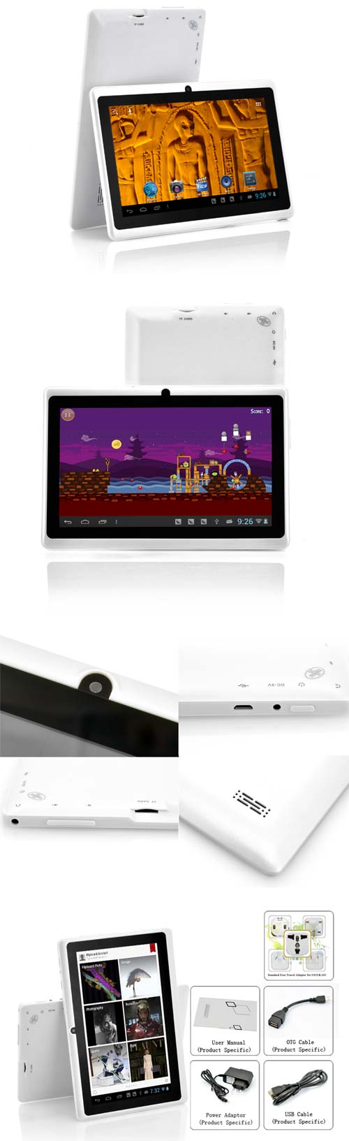 Объём памяти у планшета мал - 512МБ, места для ОС и файлов пользователя также не очень много - 4ГБ (но тут помогут карточки microSDHC). Аппарат имеет микрофон и динамик, 0.3МП фронтальную камеру, поддержку 802.11 b/g/n WiFi, порт Micro USB, выход на наушники, G-сенсор и акселерометр.