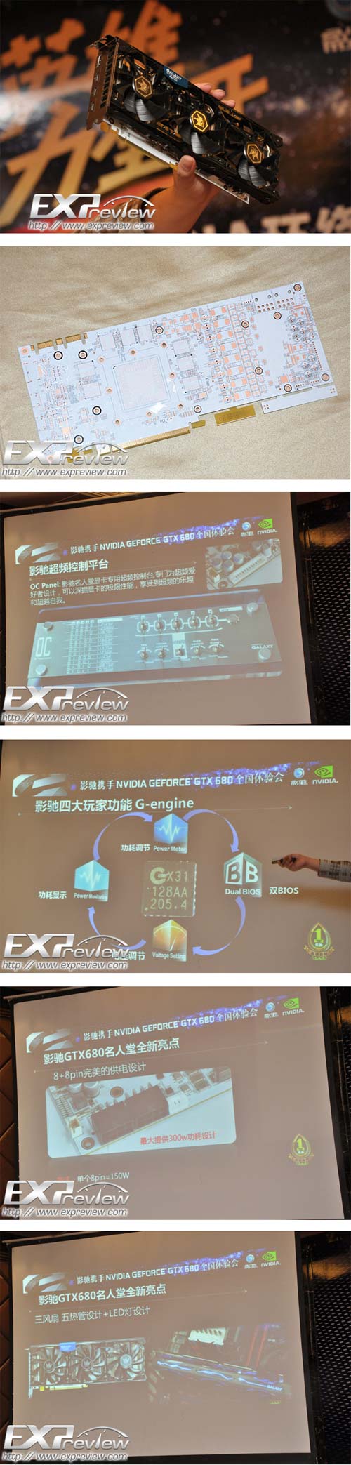 Вариант GTX 680, именуемый Hall of Fame, ещё более круче своего 4ГБ братца в плане компонентов. У карточки 8+2+2 фазовое питание, для регулировки напряжения (в том числе - программной) используется чип GX31, а питается карта от пары 8-и пиновых коннекторов. Печатная плата изделия белая, в GTX 680 HoF используется двойной BIOS, в комплекте идёт панель, чем-то напоминающая EVGA EVBot, да выполняющая те же функции (помогает в деле разгона), название её - OC Panel. Сказано, что заводской разгон будет очень неплохим, но конкретных цифр приведено не было. В системе охлаждения используется три 90мм вентилятора, кожух СО подсвечивается светодиодами. Для любителей оверклокинга предусмотрены точки замера напряжений.