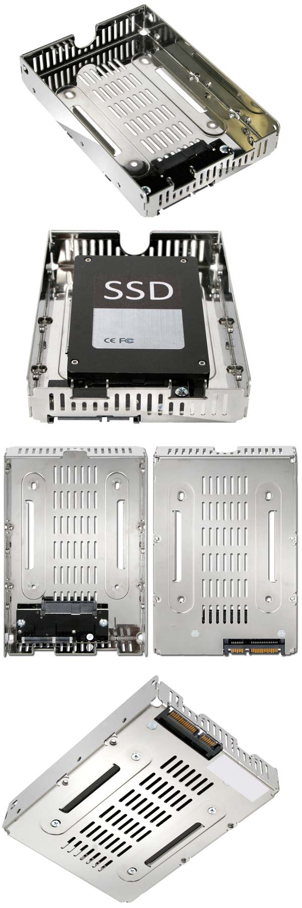 Производитель заявил о том, что его детище поддерживает работу с любыми 2.5" HDD/SSD SATA, толщина/высота которых не превышает 15мм, минимумом значится 7мм. Корпус этого переходника сделан из качественной стали и перфорирован для возможности обдува находящегося внутри накопителя.