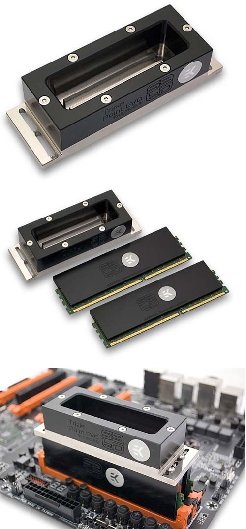 Испарительный кулер EK-SD3D Triple Point EVO разработан с участием финского оверклокера Petri 'SF3D' Korhonen и команды дизайна и инженеринга EKWB. Помимо самого устройства, были представлены "модульные адаптеры", так обозвали системы охлаждения модулей памяти, оснащённые температурными датчиками.