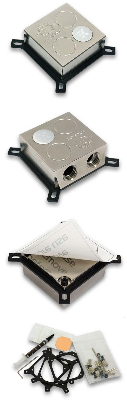 Водоблок полностью сделан из металла, основание его медное, но при этом никелированное. Он совместим с видеокартами, расстояние между крепёжными отверстиями у которых составляет от 53x53мм до 58x58мм.