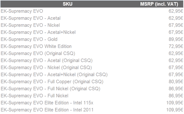 Некоторые варианты EK-Supremacy EVO уже доступны на сайте EKWB, другие появятся там позже. Полный список изделий и цен на них в слайде ниже: