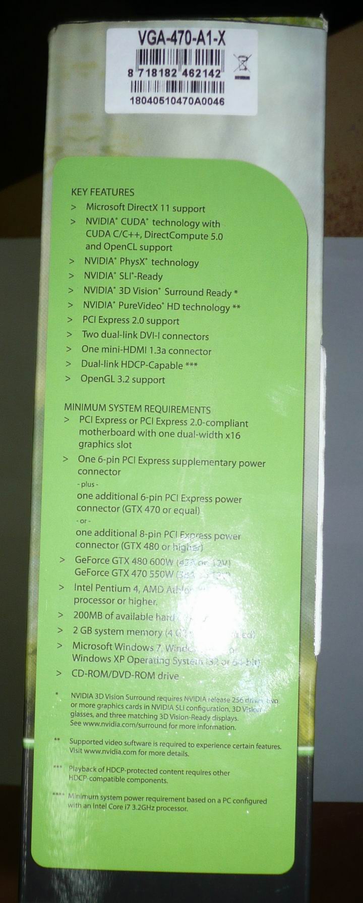 Коробка крупным планом. Наклейки в правом нижнем углу свидетельствуют о том, что перед нами именно EXO Extreme Overclock Edition, а не обычная GTX470.