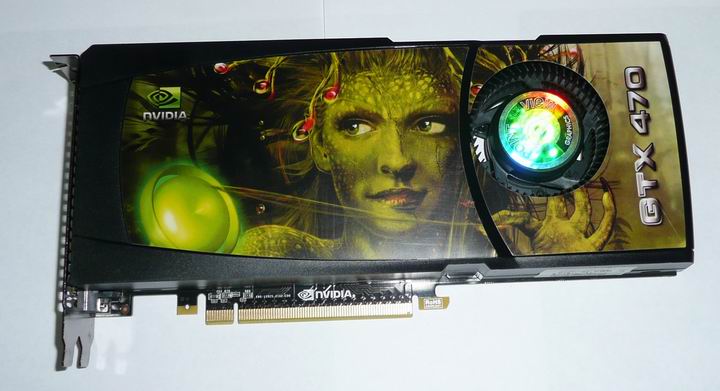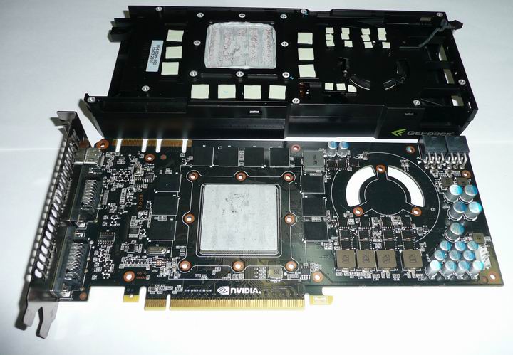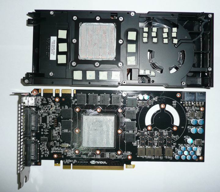 Хорошо знакомая нам печатная плата GTX470, графическое ядро GF100 заботливо замазано термопастой от стоковой системы охлаждения
