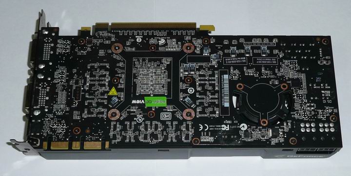 Вид сзади, печатная плата карты, судя по всему, референсная. Видны два разъёма для SLI-мостиков, дабы в будущем организовать 2-way или 3-way SLI. Питание карточки осуществляется через два шестипиновых коннектора от БП.