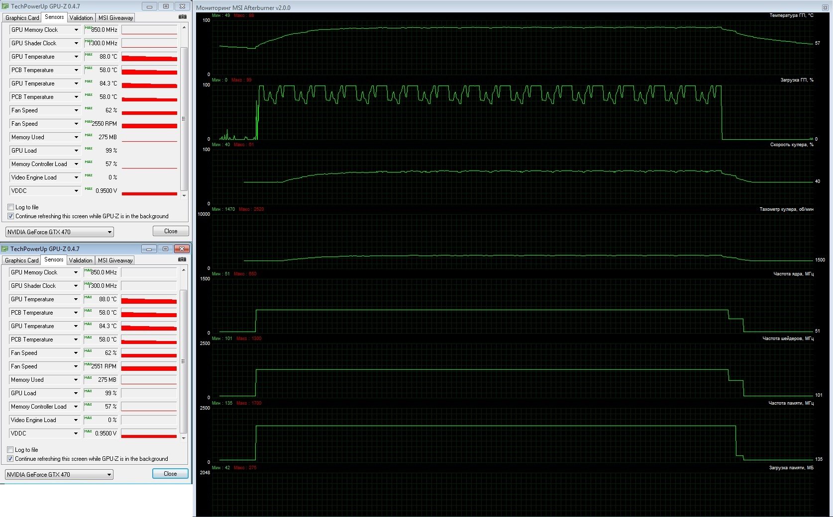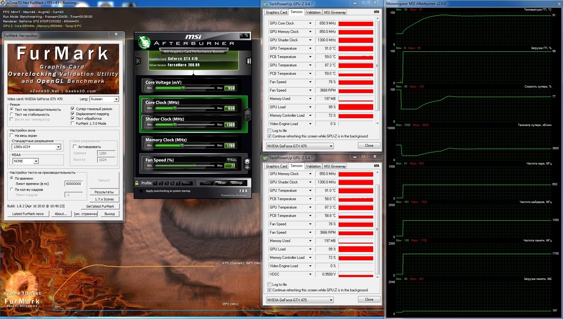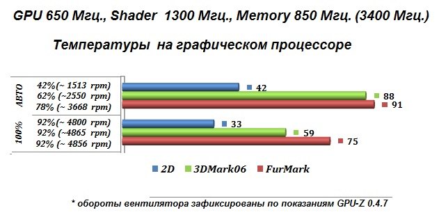 Температура видеокарты в 3D, прогрев осуществлён FurMark (скорость кулера выкручена на 100%):