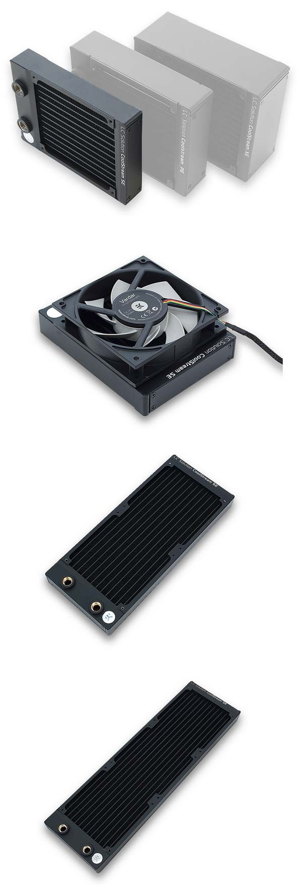 Сначала поговорим о семействе тонких радиаторов EK-CoolStream SE, предназначенный для совместного использования с вентиляторами EK-Vardar 120мм. Толщина новинок составляет 25мм, решения могут иметь размеры 120x25, 240x25, 360x25 и 480x25 миллиметров. Дизайн изделий именуется не иначе как минималистичным, компоненты изготовления - качественными, ну а для установки фитингов используется резьба G 1/4. Стоимость новинок составляет 39.95, 54.95, 65.95 и 79.95 евро.