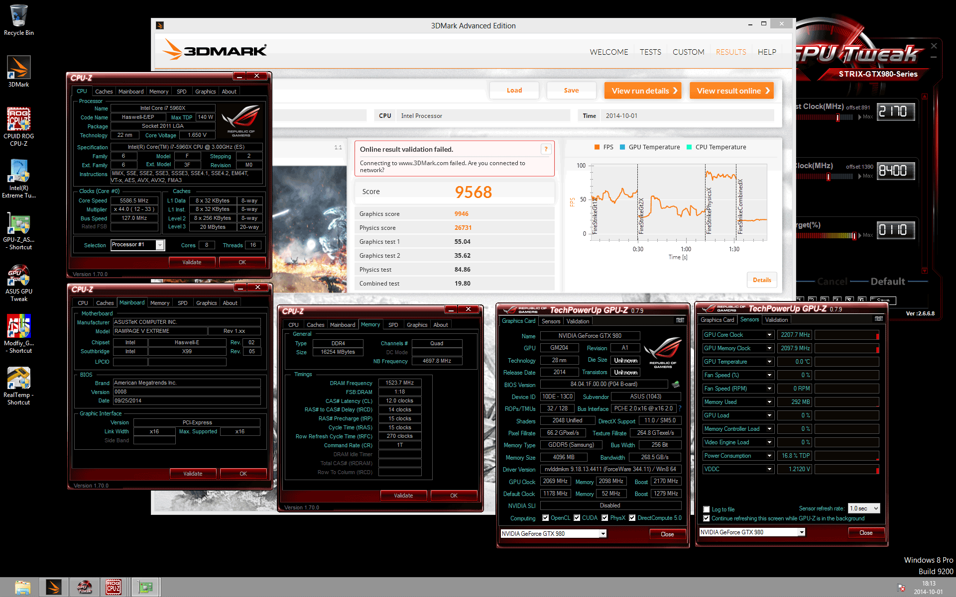 Его стараниями была весьма круто разогнана видеокарта GeForce GTX 980 DirectCU II от ASUS - до 2208МГц, т.е. на 81.58% от начальной тактовой частоты ядра. Швед поставил рекорд и в 3DMark Fire Strike Extreme, используя как раз эту карту, им было набрано 9568 очков.