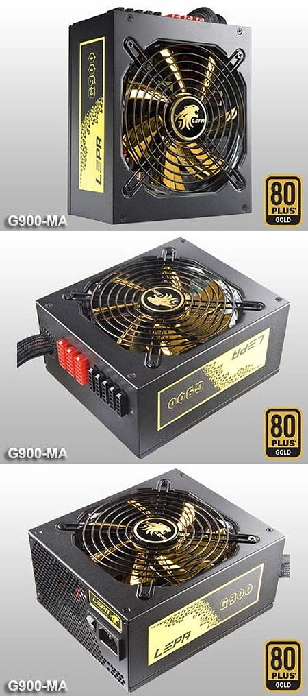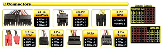 Три новинки (мощностью 500, 700 и 900 ватт), все как одна, имеют по четыре линии 12V, сертификат 80 Plus Gold, оплетённые кабели, 140мм вентилятор с PWM-управлением и активную коррекцию фактора мощности (APFC). Забавно, что кроме этих трёх БП была запущена в производство и 850 ваттная модель с сертификатом 80 Plus Bronze. Дизайн блоков питания - модульный, количество и тип кабелей указаны на одной из фотографий ниже.
