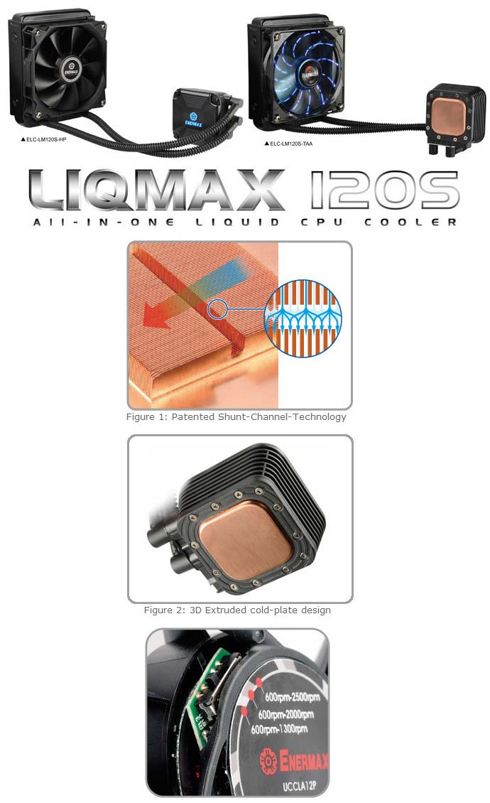 Процессорная система жидкостного охлаждения закрытого типа LIQMAX 120S призвана эффективно и тихо охлаждать процессор компьютера. Моделей СВО две - ELC-LM120S-HP и ELC-LM120S-TAA, в первой применяется вентилятор с высоким показателем статического давления, а во втором используется обычный вентилятор с LED подсветкой синего цвета. В новинках применяются фирменные наработки Enermax: Shunt-Channel-Technology (SCT) и Smart APS.