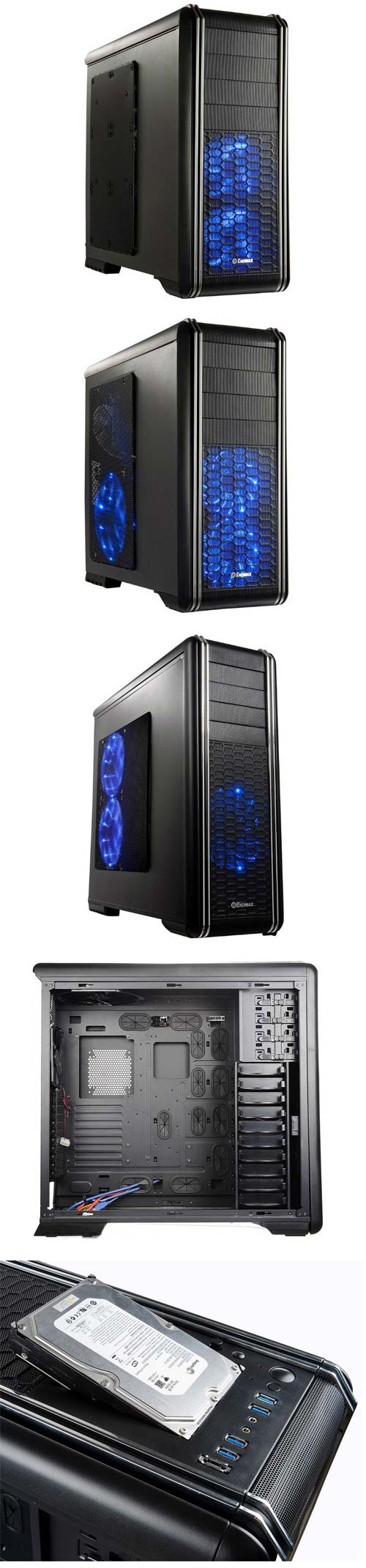 Оставшиеся две модели Fulmo - ECA892AG-BL и ECA892BG-BL имеют габариты 520х221х505мм, поддерживают системные платы форм-факторов MicroATX и ATX, у них по четыре отсека для 5.25" девайсов, да шесть мест под 3.5" накопители. Модель ECA892BG-BL обладает парой 120мм вентиляторов Vegas, расположенных спереди и сзади, а также портами USB 2.0 и 3.0 (по одному каждого типа). ECA892AG-BL более навороченное шасси - у него по два USB 2.0 и 3.0 порта, плюс есть пять вентиляторов - 120мм на задней и верхней стенках, пара Vegas'ов 120мм на передней стенке и один 180мм Vegas на боковой стенке. Плюс, у данной модели шасси имеется контроллер вентиляторов, что явно не лишнее с учётом их количества.