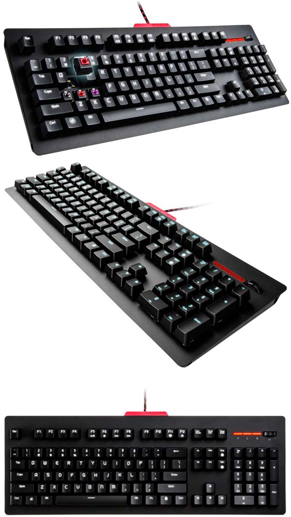 Количество клавиш равно 104, раскладка английская, сила срабатывания клавиши - 50 граммов, дистанция срабатывания - 1.5мм, полная длина хода от нажатия - 4мм. Клавиатура полностью программируемая с помощью комплектного софта, дополнительно можно приобрести макро "кийпад" с 24 клавишами, тыловой бампер с тремя портами USB 3.0 и аудио-портами для микрофона и наушников, различные подставки под кисти рук, наборы клавиш и колпачков и всё в таком духе.