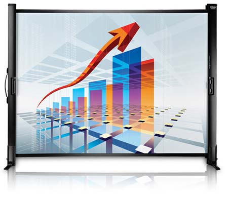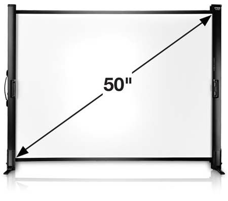 Иногда бывает крайне сложно найти приличную поверхность, на которую можно вывести изображение, ведь не всегда под рукой гладкая белая стена или что-то такое. Вот на этот случай компанией Epson был разработан и выпущен в производство ультра-портативный, как они его именуют, экран Epson ES1000. В чём его суть? ~3КГ штуковина ставится, где нужно и разворачивается до размера ~50" панели и уже на неё проектор будет выводить изображение.