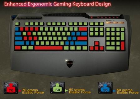 Четыре главные "фичи" устройства, по мнению производителя: эргономичный дизайн, движок макросов Ghost, 20 anti-ghosting клавиш (имеется в виду количество клавиш, которое можно одновременно нажать без "залипания" клавиатуры), и регулятор громкости. Странно, что Gigabyte не упомянул про LED-подсветку, пару USB 2.0 портов и оплетённый хлопком шнур клавиатуры.
