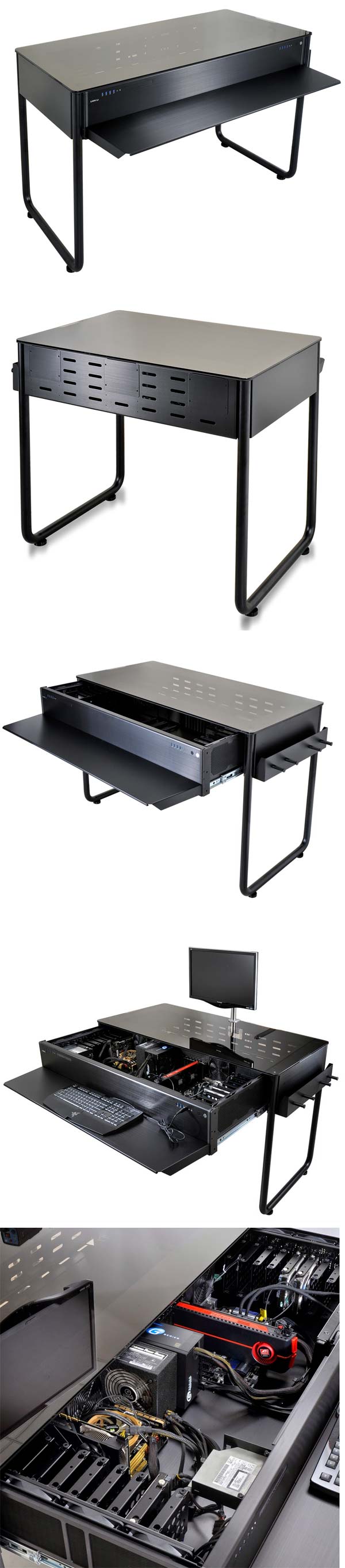 Аппарат DK-02X также является столом-корпусом для ПК, но он ещё интереснее своего предшественника, т.е. имеет место внутри себя сразу для двух компьютеров, пусть и не для равноценных. В семьях, где ПК несколько и компьютерные столы занимают немалую часть комнаты, новый продукт Lian Li будет как глоток воды в пустыне. Размеры новинки составляют 1250x805/835x600мм, а отсек для клавиатуры имеет размеры 1150x50x240мм. Верхняя часть оригинального шасси сделана из закалённого стекла, выдерживает вес до 80КГ, само шасси сделано из алюминия, а ножки стола из железа. Вес аппарата весьма внушителен - 45 килограммов.