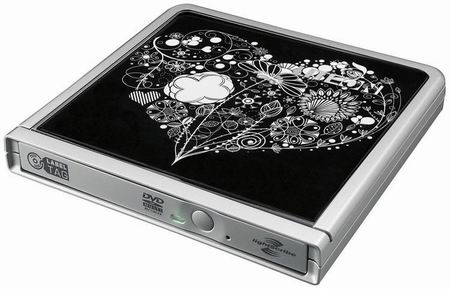 Технических данных по новому рекордеру почти нет (известно, что он пишет DVD-R/+R на 8Х, а подключается по USB 2.0 плюс поддерживает технологии LabelTag и Lightscribe), но как я уже говорил, известна его основная "фича". Владелец новинки сможет приукрасить скучный внешний вид устройства какой-нибудь своей фотографией или же картинкой с изображением чего-либо. Достаточно снять с DVD-рекордера верхнюю прозрачную крышку, засунуть под неё подходящий по размерам графический материал, закрыть крышку - и готово!
