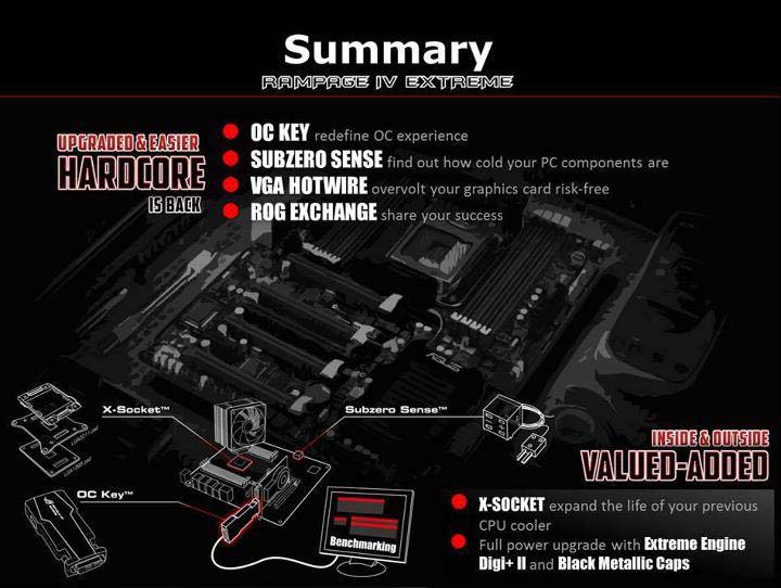 Одним из таких решений стала системная плата Rampage IV Extreme. Она может похвастаться кучей маркетинговых "фич" (на которых я не стану акцентировать внимание, хотя X-Socket, что позволяет установить на плату кулер, не предназначенный для процессоров LGA2011, вполне достойна внимания), а также следующими характеристиками: пять слотов PCIe x16 (есть поддержка тандемов из четырёх видеокарт Nvidia или AMD), восемь слотов для оперативной памяти DDR3, четыре порта SATA 6Гб/с, да столько же SATA 3Гб/с.
