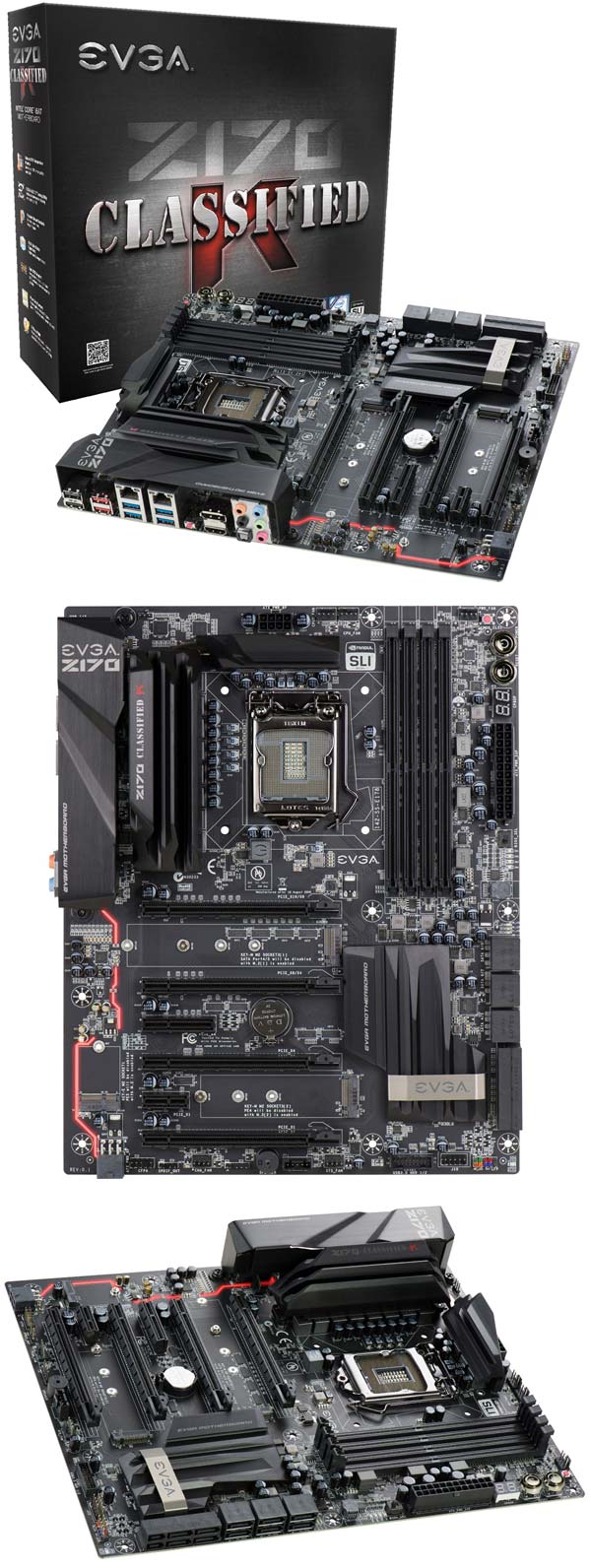 Устройство получило имя EVGA Z170 Classified K, плата базируется на чипсете Z170 Express от Intel, обладает четырьмя слотами для оперативной памяти DDR4 3600МГц, установить которой можно 64ГБ максимум. PCIe 3.0 x16 слотов четыре, есть поддержка 2-way SLI, в девайсе применены твердотельные конденсаторы, форм-фактор изделия ATX.