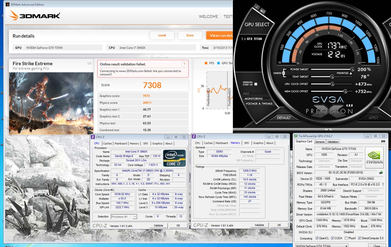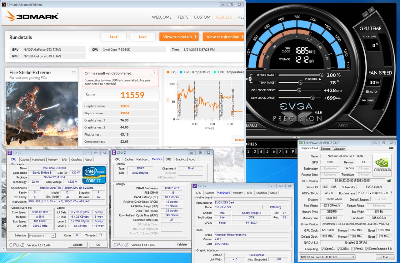 Указанный деятель и его спонсор решили, что нечего ASUS делать на первом месте в Fire Strike, потому без особого труда её оттуда сместили. Для установления сразу четырёх рекордов использовалась пара (или одна, в двух случаях) экстремально разогнанных видеокарт GeForce GTX Titan в SLI, работавших на материнской плате EVGA X79 Dark.