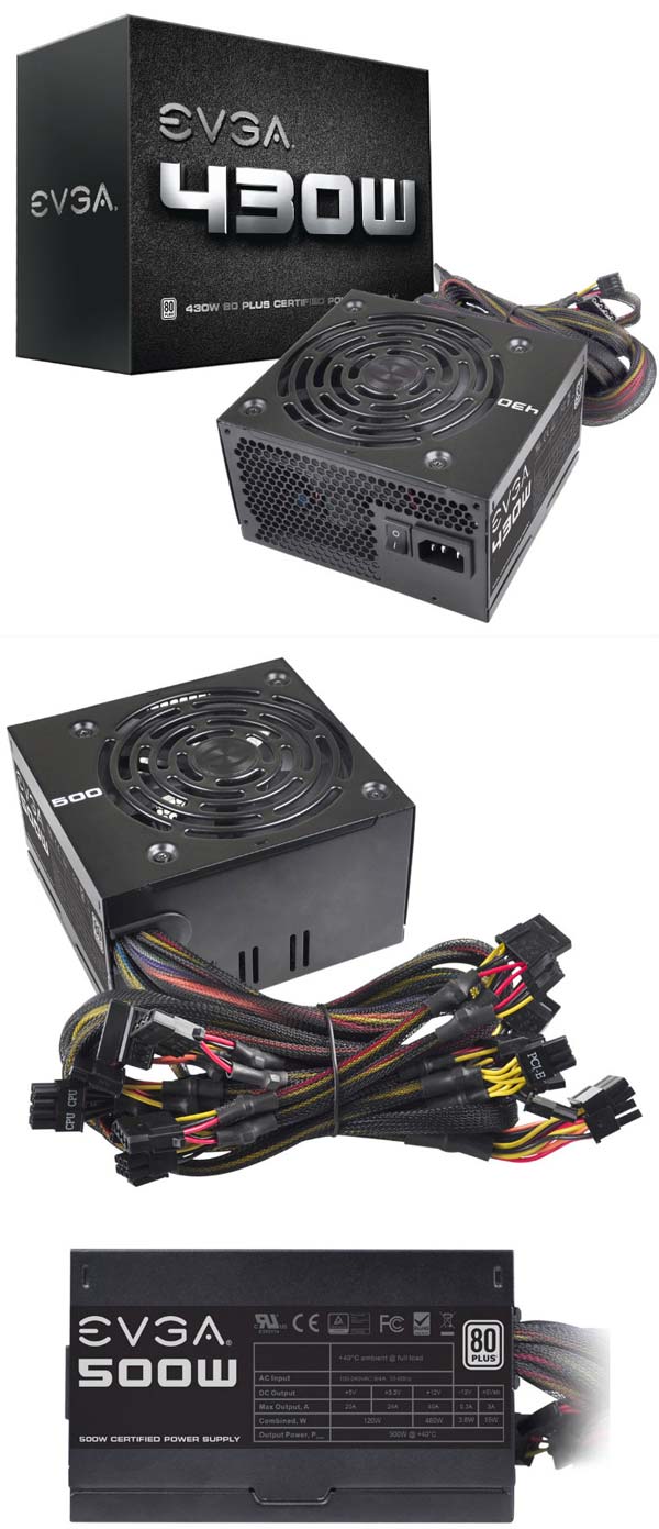 На фото показаны блоки питания 100-W1-0430-KR и 100-W1-0500-KR от EVGA