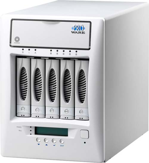 Новое устройство имеет длинное название ProNAS DN-503AH-PDC-10T. Если бы оно продавалось без накопителей, то пользователь был бы волен поставить туда до пяти винчестеров или же SSD, но производитель решил, что лучше поставлять новинку с предустановленными винчестерами. В итоге в девайсе уже стоят пять 2ТБ винчестеров, работающих в режиме RAID 6. Подключение накопителей осуществлено по SATA 3Гб/с, скорость передачи данных не озвучивается.