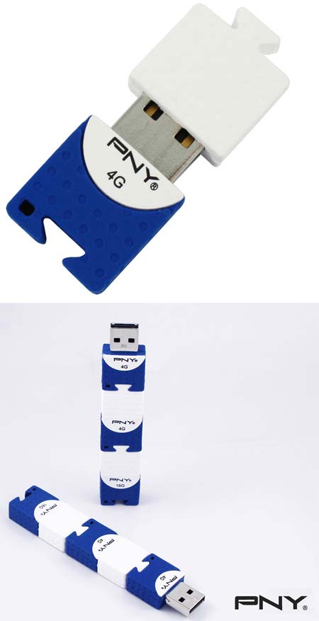 Габариты новинки составляют 9.3х18.3х37.3мм, вес равен 6.6 граммам. Корпус флешек сделан из прочного полимерного материала, особенностью дизайна является возможность засунуть одну флешку в другую, выстроив таким образом нечто вроде... длинной флешки. Однако, в отличие от продукта Yanko Design, новинка от PNY не улучшает своих скоростных характеристик в зависимости от количества всунутых одна в другую флешек.