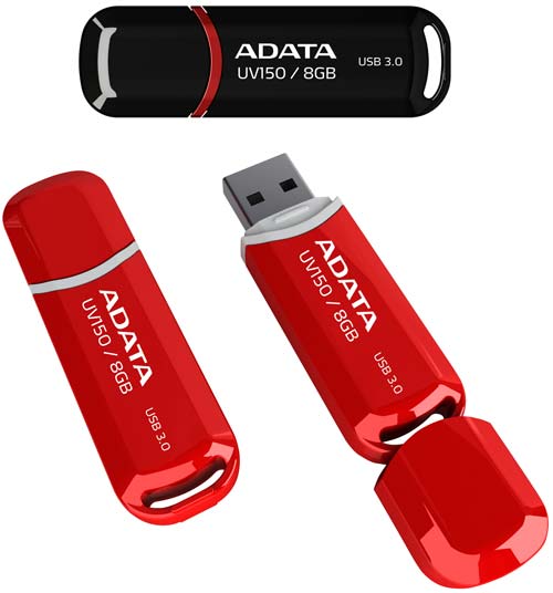 Изделия DashDrive UV150 куда более интересны для потребителей, т.к. самой ADATA они задуманы как доступные по цене USB 3.0 флешки. Цвет корпусов накопителей - красный и чёрный, ёмкость - от 8 до 32ГБ, размеры составляют 58x18x11мм, вес равен 9 граммам. К моей радости, нам были озвучены скоростные спецификации новинки, по крайней мере показатель линейного чтения, который равен 90МБ/с, а также записи - 20МБ/с.