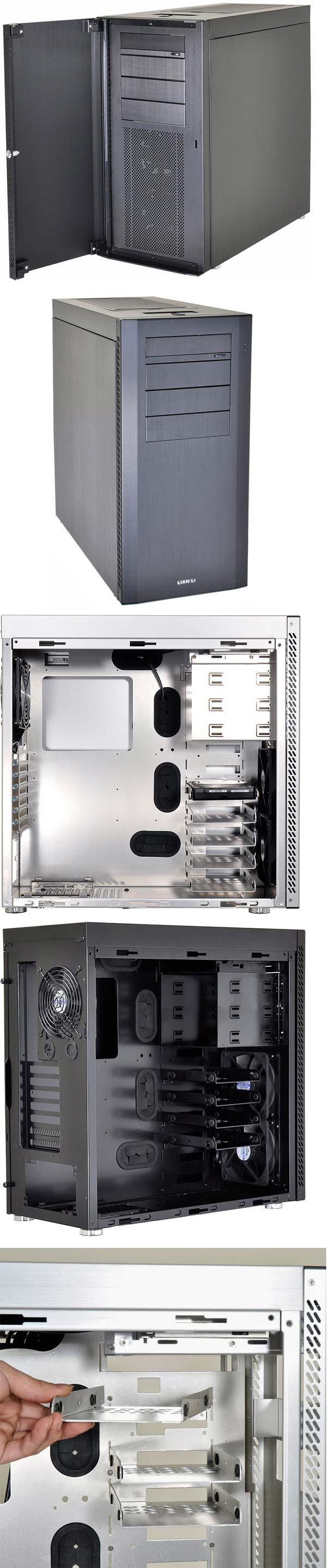 Корпуса называются PC-B16 и PC-A61, они идентичны внутри, но отличаются снаружи, у первого имеется так называемая дверка, которая обеспечивает шумоизоляцию передней части системного блока ПК, у второго шасси такой дверки нет. Размеры изделий Lian Li составляют 230x490x530мм, вес равен 6.5КГ, доступные цвета: целиком чёрный и белый.