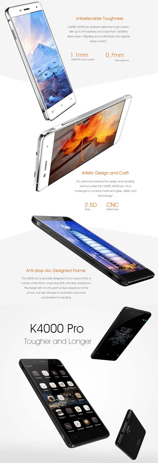 Итак, Oukitel K4000 Pro является обладателем 5" IPS экрана с разрешением 720p, тачскрин защищён крепким 2.5D изогнутым стеклом (9H/1000мПа), он ёмкостного типа с поддержкой 5-точечного Multi-touch. Корпус решения отделан крокодиловой кожей, в процессе изготовления металлического шасси применена технология CNC.
