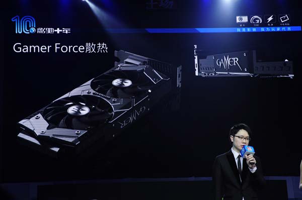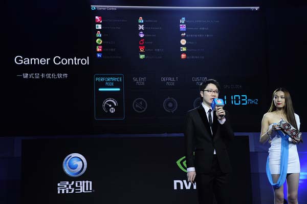 Нам показывают софт Gamer Control, который позволит управлять её кулером, осуществлять разгон карты Galaxy, её мониторинг и всё в таком духе: