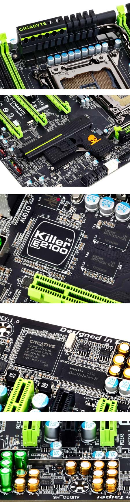 Итак, перед нами очередной "убийца" от Gigabyte. Новинка обладает тремя слотами PCIe x16, четырьмя слотами для памяти DDR3, таким же количеством SATA 3Гб/с и двумя SATA 6Гб/с. На "борту" системной платы находятся профессиональная сетевая карта (как бы глупо это не звучало) Killer 2100 NIC, два БИОСа, а также аудио-решение X-Fi от Creative. Радиатор в виде оружия (в данном случае - пистолета) традиционно присутствует на новинке. Вот и вся доступная пока информация по G1.Assassin 2, уважаемые читатели.