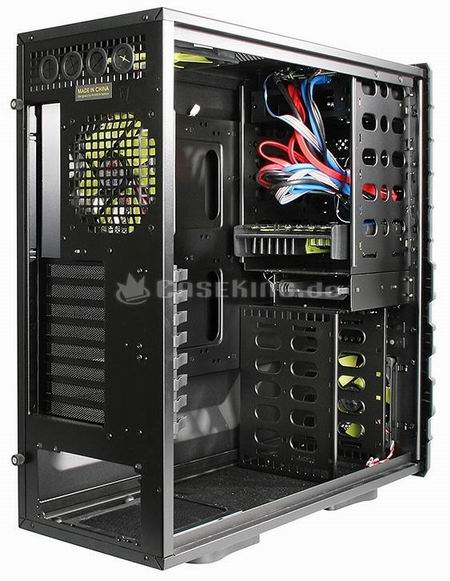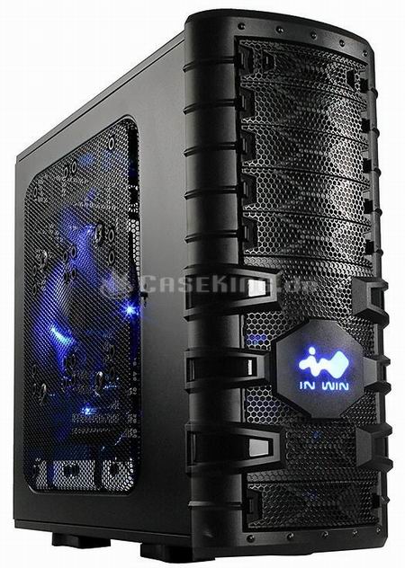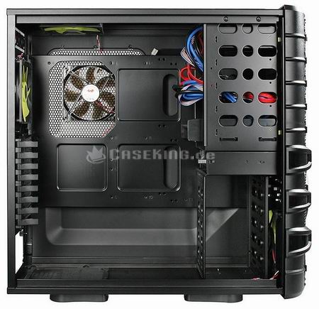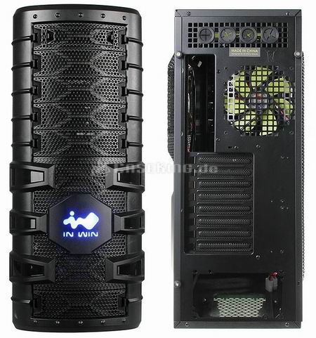 Корпус, как Вы уже поняли, довольно-таки здоровенный, его габариты - 556х239х578мм, а вес - 10КГ. Материал изготовления - сталь, но её толщина не указана. У полу-новинки пять отсеков для 5.25" устройств, панель в верхней части с двумя USB 3.0 и таким же количеством USB 2.0 и eSATA портов. Аудио-вход и FireWire находятся там же, что неудивительно. Стоит отметить, что перфорировано всё, что только можно, наверное это пойдёт на пользу вентиляции компонентов.