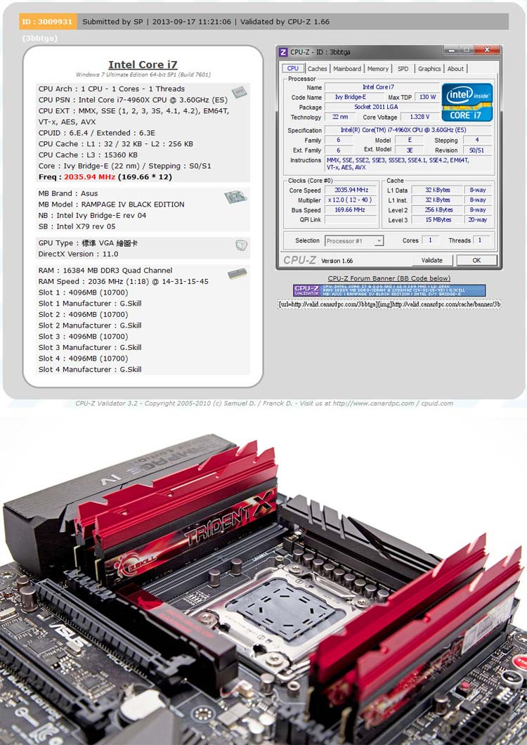 Нам было сообщено, что был поставлен мировой рекорд в деле разгона оперативной памяти в четырёхканальном режиме. Четыре 4ГБ модуля TridentX были разогнаны до впечатляющей тактовой частоты 4072МГц, это первый случай, когда набор из четырёх модулей оперативной памяти смог преодолеть 4ГГц рубеж. В тестовом стенде был задействован процессор Intel i7-4960X и системная плата Rampage IV Black Edition от ASUS, охлаждению рекорд обязан жидкому азоту.