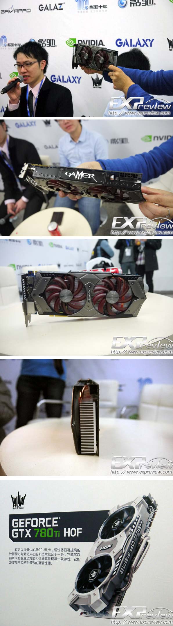 Вторая показанная новинка - видеокарта серии Hall of Fame на базе GeForce GTX 780 Ti, самого быстрого игрового решения Nvidia. Тут всё стандартно для серии HOF - печатная плата карты белого цвета, кулер тоже белый. Кстати о системе охлаждения - она ухитряется занимать три слота, использует алюминиевый радиатор с 8мм теплотрубками и пару вентиляторов. Питается видеокарта GeForce GTX 780 Ti Hall of Fame от двух коннекторов БП, использует 10-фазовое питание, а также качественные компоненты - чипы IR3550 PowIRstage DrMOS и контроллер CHiL CHL8318. Частоты карточки не сообщаются, но нас уверяют в том, что творение Galaxy будет самой быстрой GTX 780 Ti в мире.