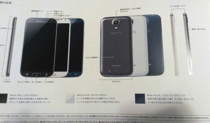 Помимо чёрного (Black Mist) и белого (Frost White) цветов, флагман Samsung будет доступен в синем цвете - Blue Arctic. Слайд с изображением новинки стал доступен в Японии, где оператор связи NTT DoCoMo предлагает такой вариант S4 вместе с определённым тарифным планом. Будет ли доступен цвет Blue Arctic для других регионов/операторов - неизвестно.