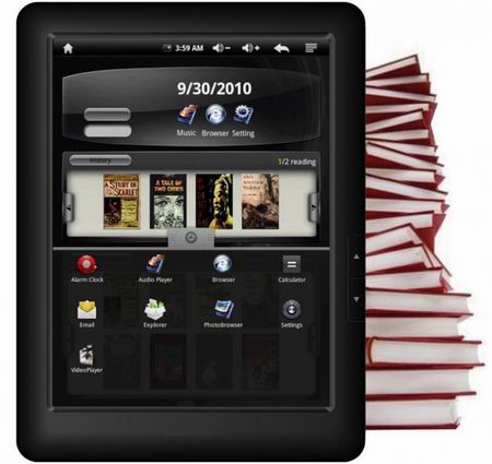 За все вычислительные операции отвечает двухъядерный процессор ARM9, работающий на тактовой частоте в 660МГц. Количество оперативной памяти не указано, зато известен объём накопителя - 4ГБ. Если такой ёмкости будет недостаточно, можно докупить SD карту на 32ГБ и вставить её в соответствующий слот на корпусе устройства. Имеются mini USB порт и 3.5мм разъём "джек" для наушников. Не обошлось и без традиционной, для планшетных компьютеров, но не e-book reader'ов, поддержки 802.11 b/g WiFi.