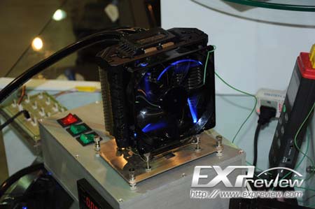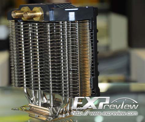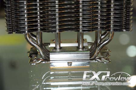 У радиатора медное основание, такие же теплотрубки (пять штук, диаметр - 6мм), пронизывающие алюминиевые пластины и 120мм вентилятор, характеристик которого озвучено не было.